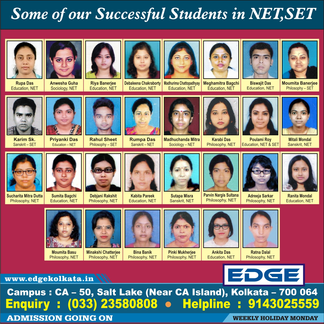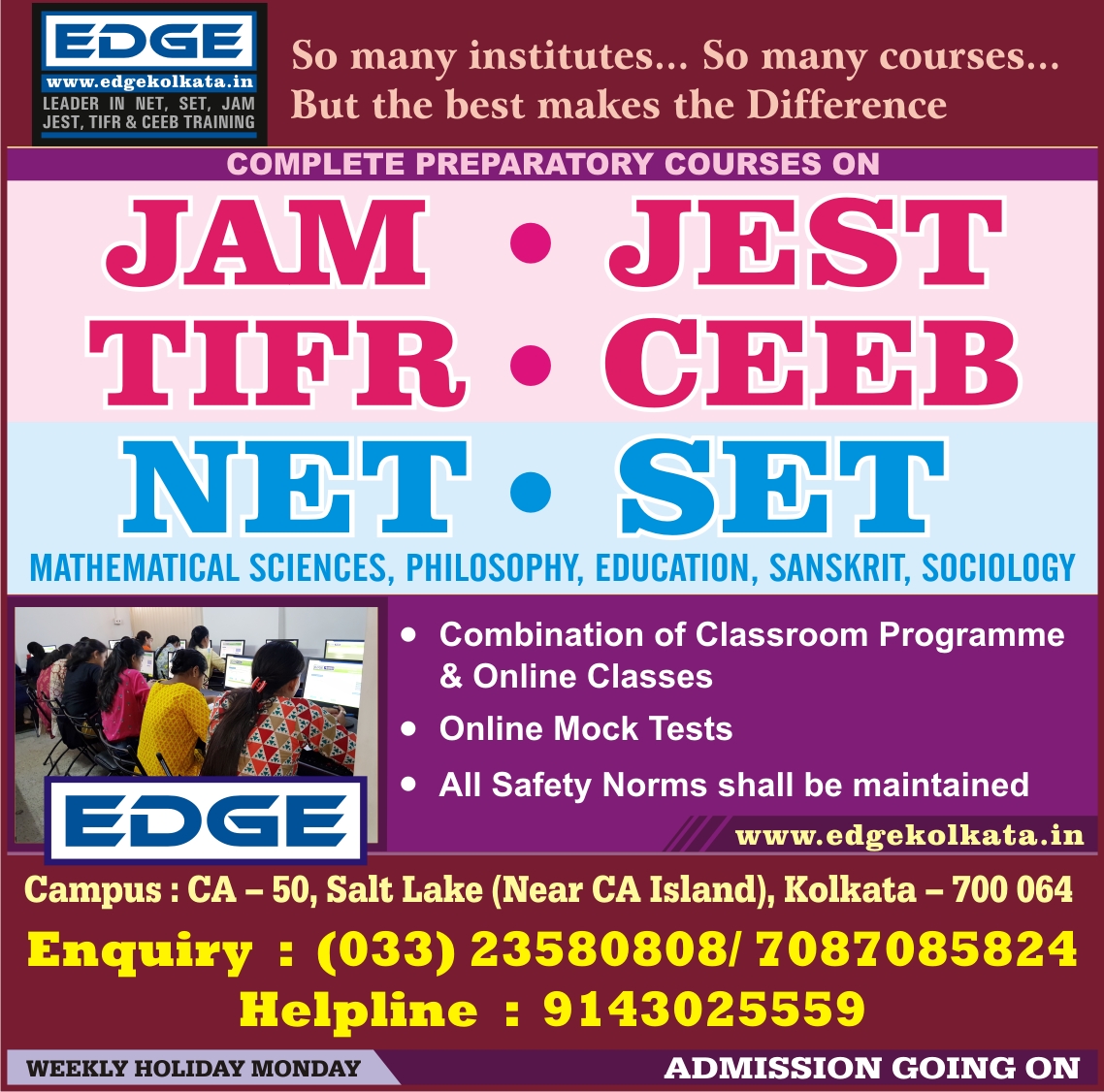 We, at EDGE, offer comprehensive and well-structured preparatory courses on NET/SET [Mathematical Sciences, Philosophy, Sanskrit, Education & Sociology], IIT-JAM, (Physics, Chemistry, Mathematics Biotechnology), JEST, TIFR, CEEB.